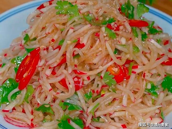 1、洗净的萝卜切成薄一点的片,再切成均匀的细丝,切好后加入一勺白糖,抓拌均匀,腌制十分钟,腌出多余的水分,千万不要清洗,只要攥干水分。