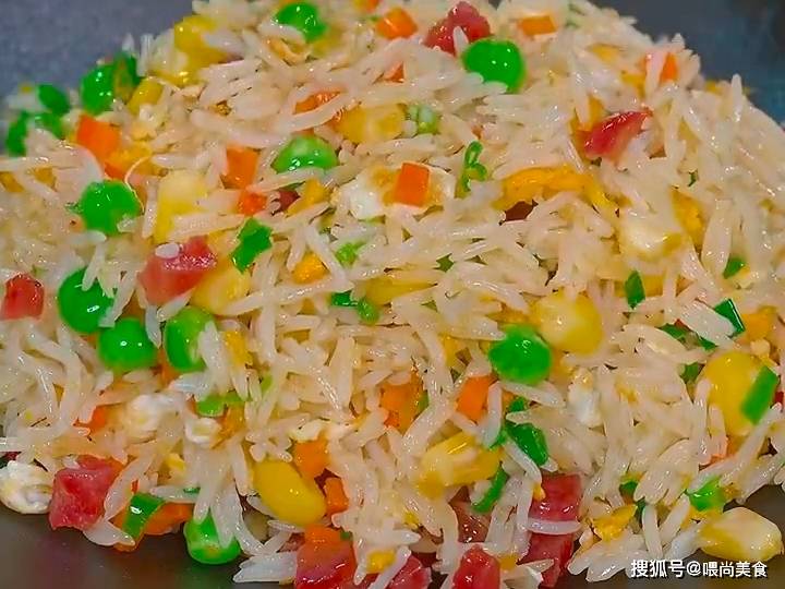 2、放入火腿丁,玉米粒,胡萝卜丁,豌豆粒,再加入盐、鸡精,继续用大火快速翻炒,炒干炒出水分,撒入葱花,快速翻炒均匀即可。